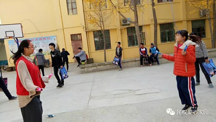 志愿者与孩子们互动开展跳绳比赛